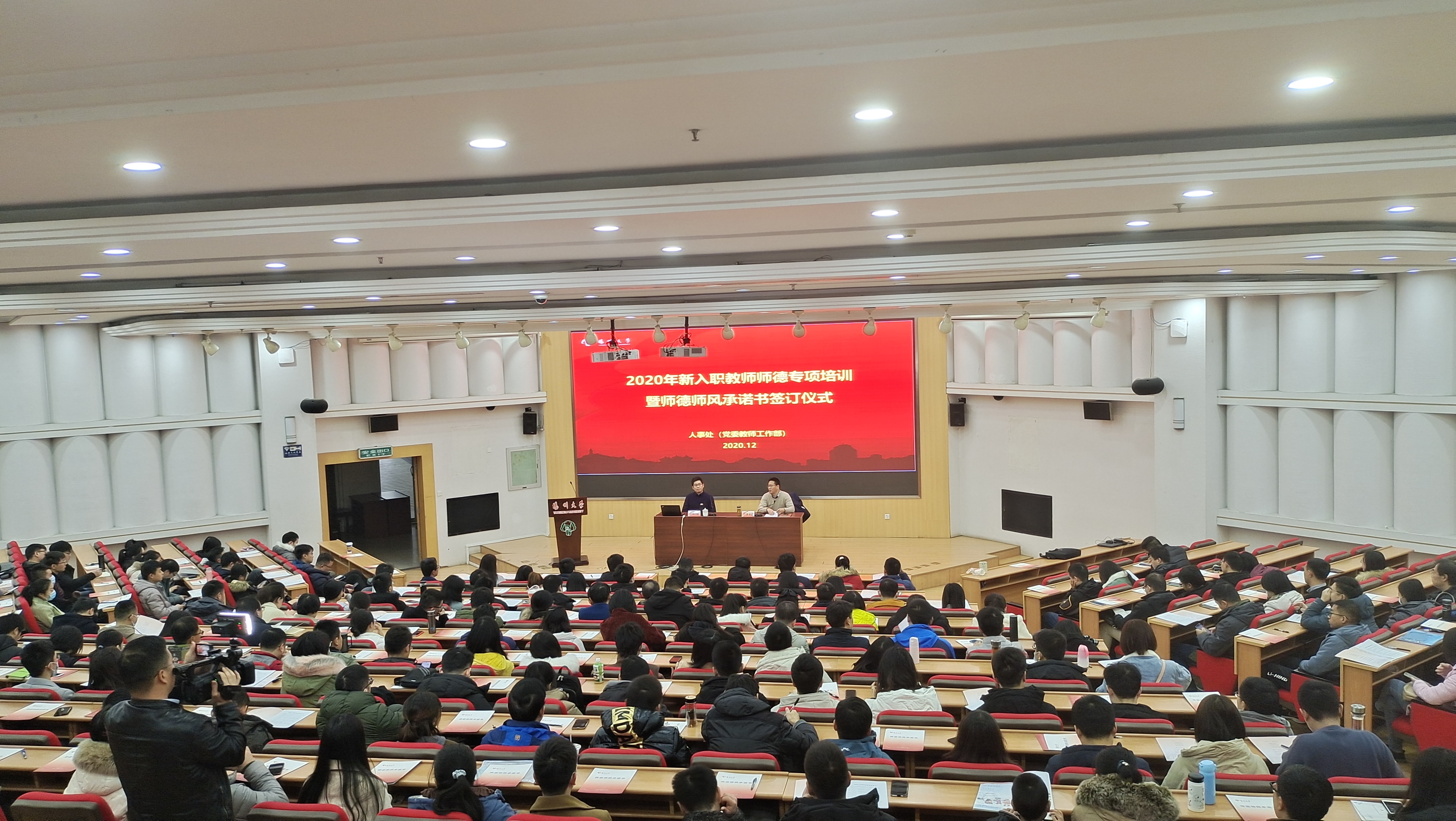 12月13日上午,学校在荷花池校区逸夫图书馆报告厅举行2020年新入职教师师德专项培训暨师德师风承诺书签订仪式。200多名新入职教师共同签订了师德师风承诺书,并参加了“弘扬高尚师德,潜心立德树人”为主题的师德专项培训。人事处(党委教师工作部)负责同志,全体新教师参加了本次活动。