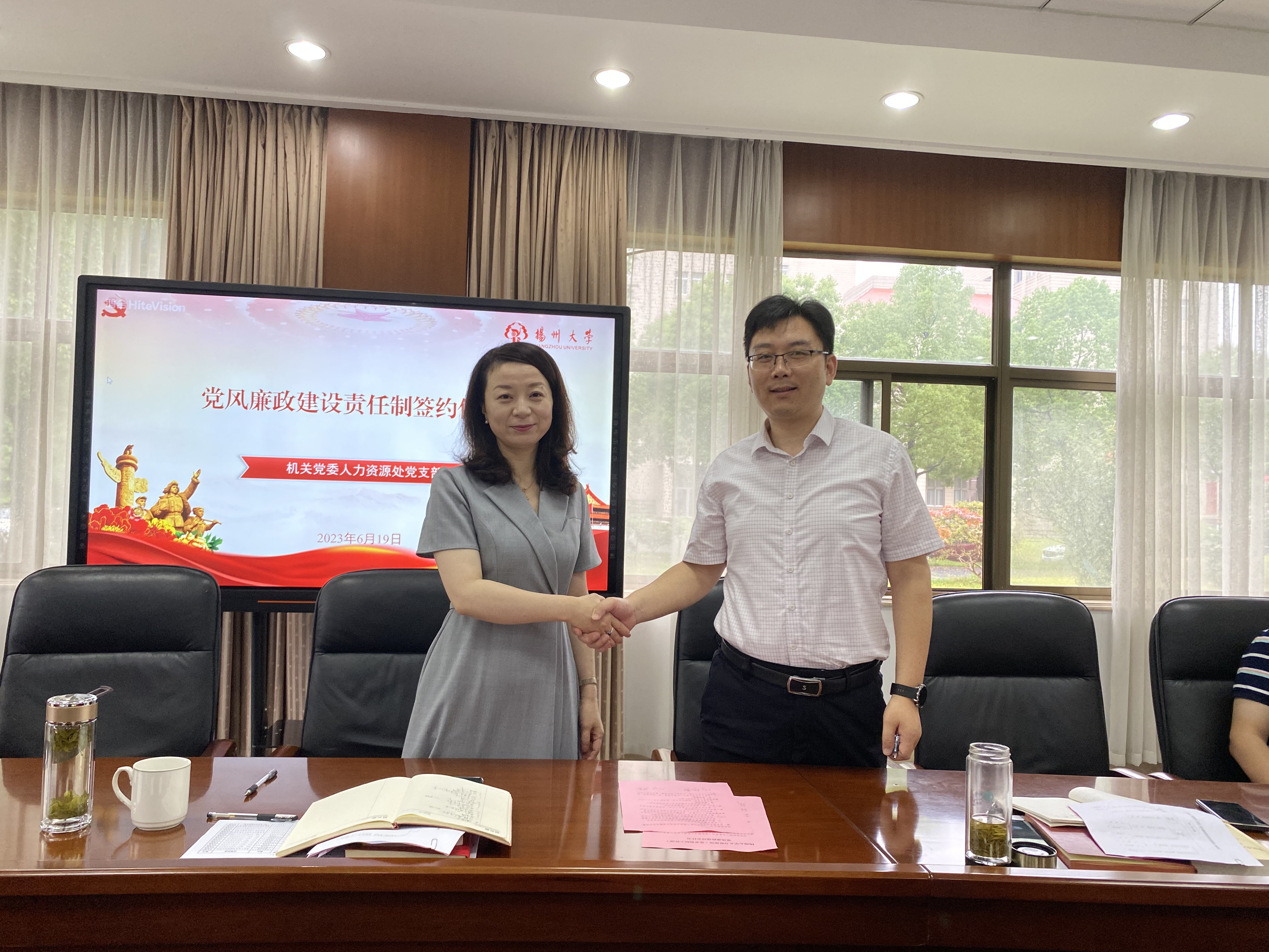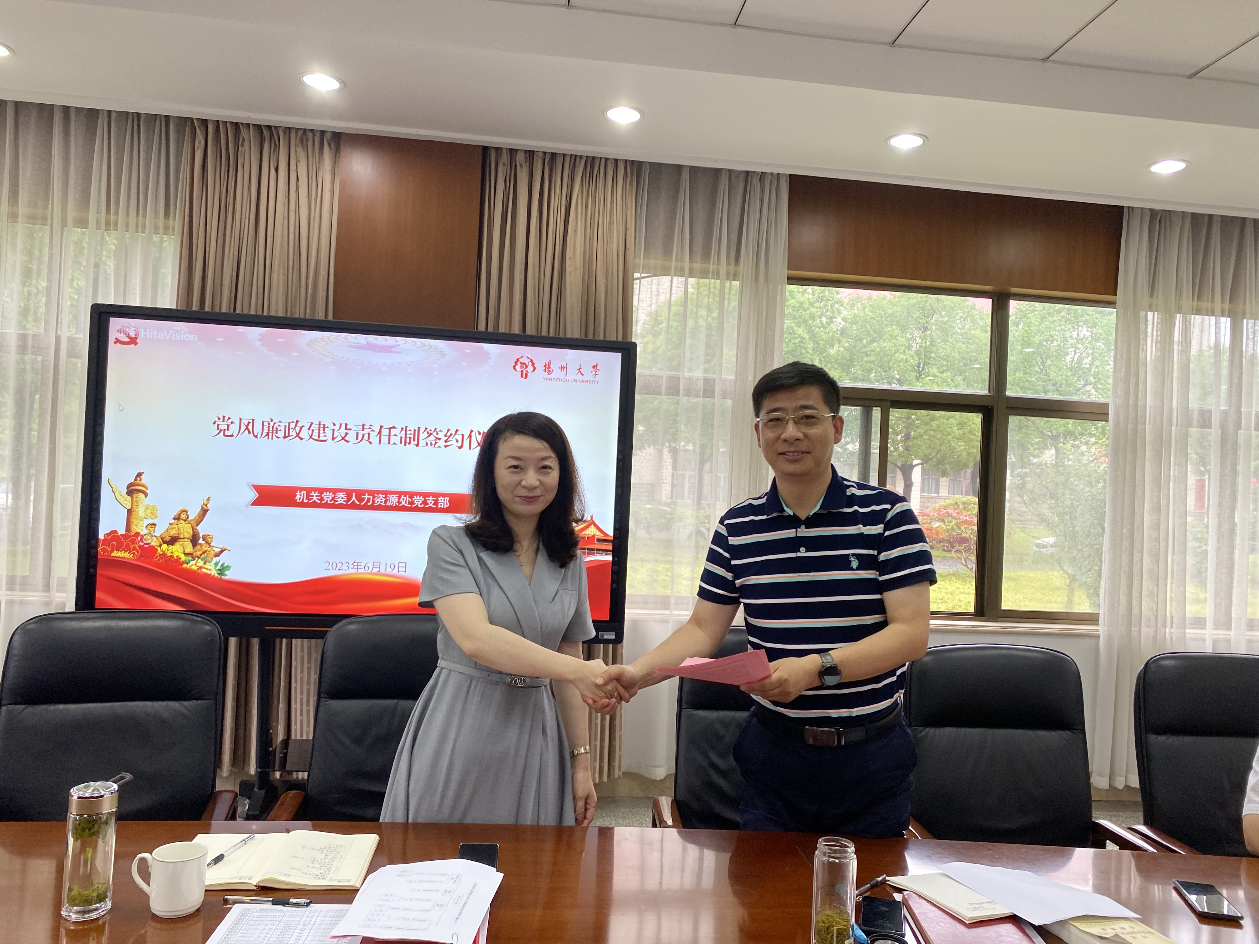 6月19日上午,人力资源处党支部开展党风廉政建设专题教育活动。会议就人力资源处党支部党风廉政建设责任制网络调整事宜做了说明;责任人与责任对象分别签订了《扬州大学人力资源处(党委教师工作部)党风廉政建设责任书》,以“军令状”的形式把党风廉政建设主体责任落到实处。